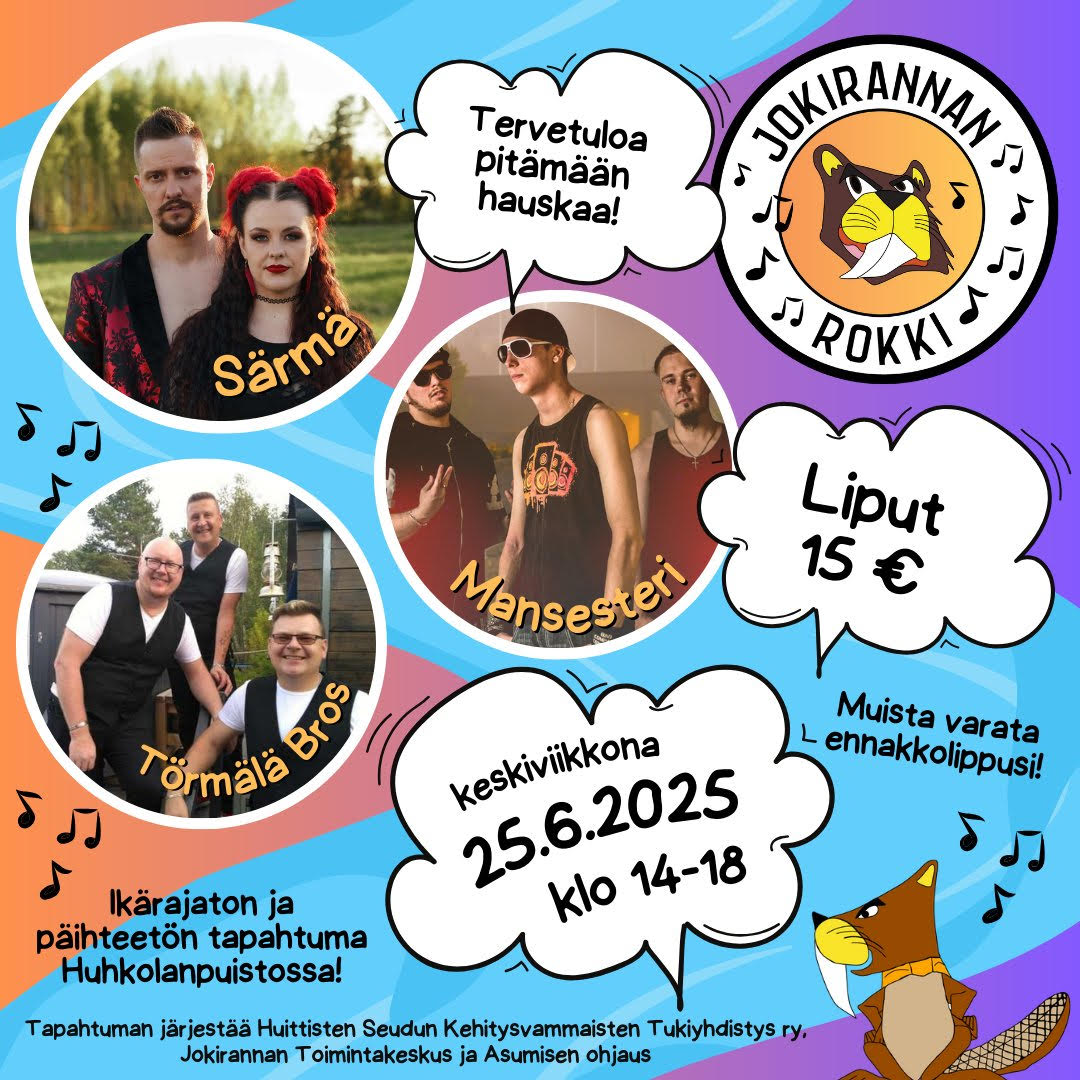 Järjestyksessä toinen Jokirannan Rokki Huittisten Huhkolanpuistossa pärähtää kesäkuussa. Lippuja ennakkoon 0405561165 tai maritta_tuominen@hotmail.com Ikärajaton ja päihteetön tapahtuma Huhkolanpuistossa Huittisissa keskiviikkona 25.6.2025 klo 14 - 18Liput 15 € Muista varata ennakkolippusi! Tapahtuman järjestää Huittisten Seudun Kehitysvammaisten Tukiyhdistys ry, Jokirannan Toimintakeskus ja Asumisen ohjaus