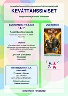 Harjavallan seudun kehitysvammaisten tukiyhdistys järjestää kevättanssit sunnuntaina 19.4.2026 Kokemäen seuratalolla klo 14-17 Harjavallan Seudun Kehitysvammaisten Tukiyhdistys järjestää KEVÄTTANSSIAISETErityisryhmille ja heidän läheisilleen Sunnuntaina 19.4. klo 14 - 17Kokemäen SeuratalollaOsoite: Seuratalonrinne 7, 32800 Kokemäki Ohjelma* Tanssin tahdit tarjoilee Duo Misteli * Buffetista pikkurahalla kahvia ja pullaa sekä makkaraa ja muuta hyvää * Arpajaiset Liput 10 € ja avustajat ilmaiseksiKäteismaksu Ilmoittautumiset 7.4. mennessä Yhteistyössä mukana: